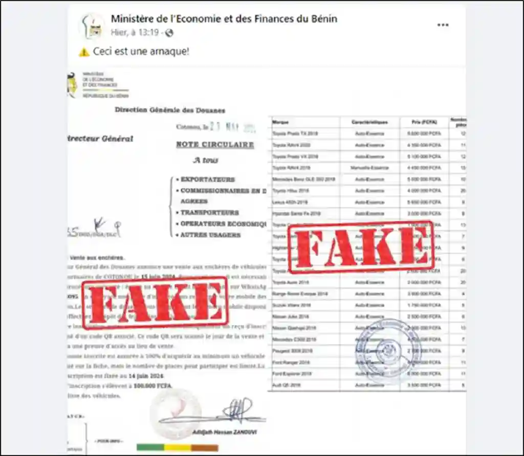 Une fausse annonce de vente aux enchères à la Douane béninoise, en date du 23 mai 2024, circule sur ...