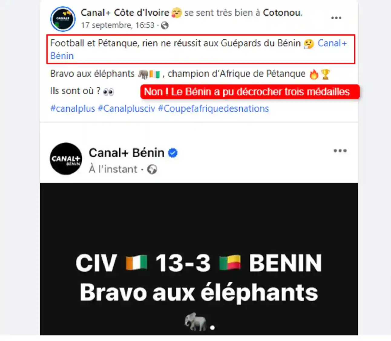 Partageant un post Facebook de Canal+ Bénin sur la défaite des boulistes béninois face à leurs homol...